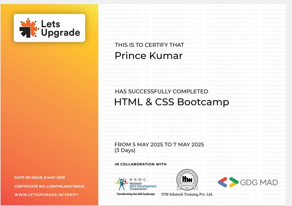 I completed an intensive HTML and CSS Bootcamp that provided a strong foundation in front-end web development. Throughout the training, I learned to structure web pages using semantic HTML5 elements and style them effectively with modern CSS3 techniques... (summary continues)