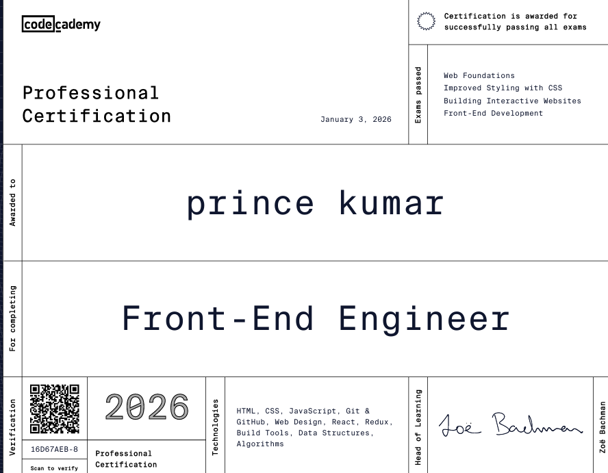 I completed an intensive HTML and CSS Bootcamp that provided a strong foundation in front-end web development. Throughout the training, I learned to structure web pages using semantic HTML5 elements and style them effectively with modern CSS3 techniques... (summary continues)