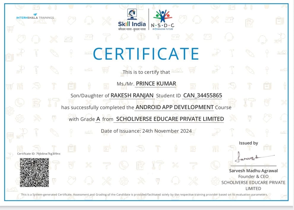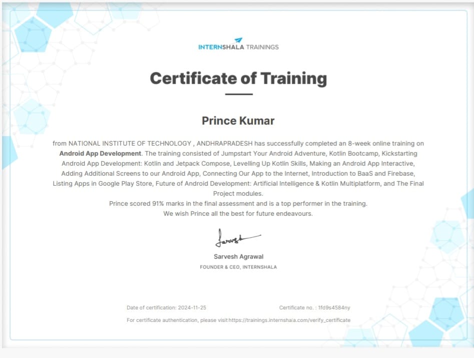 I successfully completed a comprehensive 8-week online training in Android App Development from Internshala Trainings in association with NIT Andhra Pradesh... (summary continues as in your original)