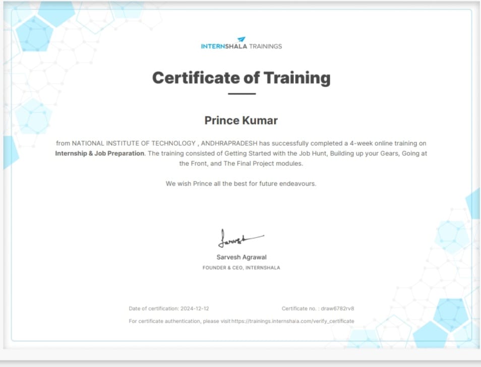 Issued by: Internshala Trainings & National Institute of Technology, Andhra Pradesh